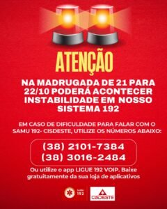 O SAMU 192 – CISDESTE informa que, na madrugada do dia 21 para 22 de outubro, o sistema de telefonia da Central de Regulação passará por manutenção programada.