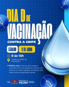 O Dia D de Vacinação Contra Gripe em Viçosa será no sábado, 11 de abril, de 08 às 16 horas, quando todas as UBS (Unidade Básica de Saúde) estarão promovendo a vacinação.