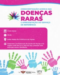 A Prefeitura de Viçosa, em parceria com a Unidade de Atenção Especializada em Saúde, realizará no dia 13 de março um evento dedicado à conscientização sobre as doenças raras e à apresentação do Serviço de Referência em Doenças Raras de Viçosa. A atividade acontece a partir das 13h30, no Salão Nobre da Prefeitura, localizado na Rua Gomes Barbosa, 803, no Centro.