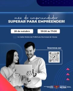 A Prefeitura de Viçosa, por meio da Secretaria Municipal de Desenvolvimento Econômico, Empreendedorismo e Inovação, promove no dia 28 de outubro, das 13h30 às 17h30, o evento “Mês do Empreendedor – Superar para Empreender”. A atividade será realizada no Salão Nobre da Prefeitura Municipal de Viçosa, localizado na Rua Gomes Barbosa, nº 803.