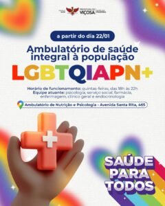 A Prefeitura de Viçosa inaugura, no dia 22 de janeiro de 2026, o Ambulatório de Saúde Integral à População LGBTQIAPN+, um serviço voltado à promoção do cuidado, do acolhimento e do acesso equitativo à saúde, respeitando as especificidades e necessidades dessa população.