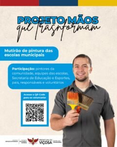 A Prefeitura de Viçosa apresenta o projeto “Mãos que Transformam”, uma iniciativa que mobiliza pintores da comunidade, voluntários e apoiadores locais para revitalizar as fachadas das escolas municipais. O objetivo é fortalecer o sentimento de pertencimento, valorizar o espaço escolar e incentivar o cuidado coletivo com o patrimônio público.