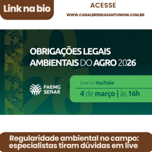 O Sistema Faemg Senar realiza nesta quarta-feira, 4 de março, às 16h, uma live no YouTube para orientar produtores rurais sobre o Calendário de Obrigações Legais Ambientais do Agro 2026. A transmissão vai esclarecer os principais prazos e procedimentos que impactam diretamente a atividade no campo ao longo do ano.
