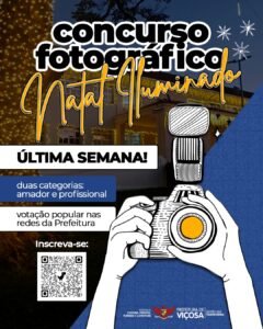 Viçosa está iluminada e este é o momento de registrar esse clima especial. A Prefeitura de Viçosa, por meio da Secretaria de Cultura, Turismo, Eventos e Juventude e do Departamento de Turismo, realiza o concurso que vai premiar imagens feitas na cidade durante o período natalino. A iniciativa conta com a parceria do Comtur e da Casa do Empresário.